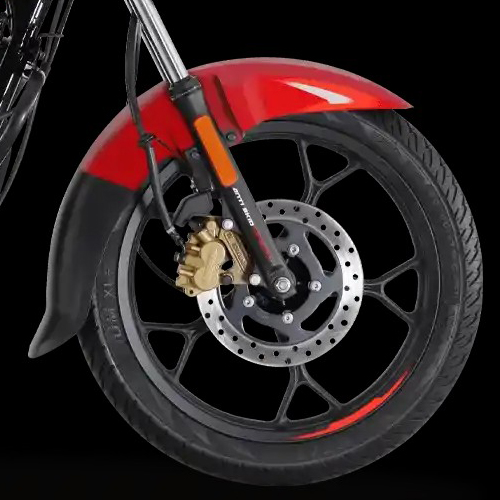 The Platina 110 H Gear uses tubeless tires on both the front and rear. The main advantage of tubeless tires is that they do not instantly lose air in case of a puncture, allowing the rider to move the bike to a safe location. The front and rear tires are sized 80/100-17, which maintains a good balance between grip and low rolling resistance, thus also ensuring good mileage.